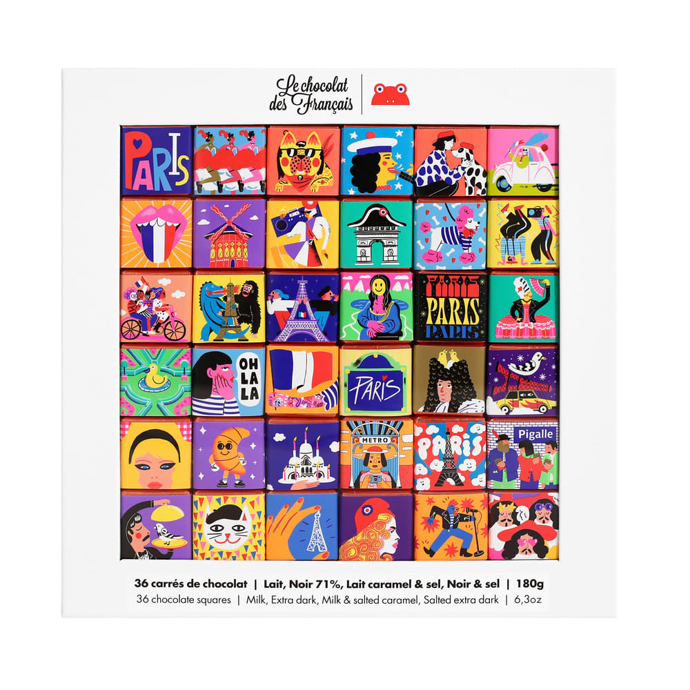 This box of 36 chocolate offers many different recipes with visuals illustrated by a variety of talented artists ! Perfect with your coffee breaks !
