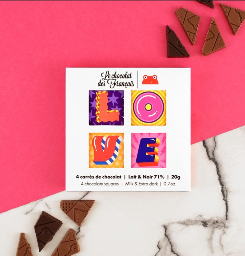 Fall for the cutest LOVE box made of 4 small organic chocolate squares. Tender milk and Extra dark 71%.
