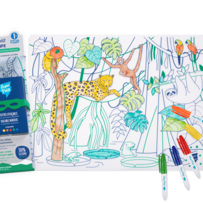 This fun tablemat set comes with 5 washable, child-safe pens and is made from soft food- grade silicone. We love the creative possibilities and great fun your child can have at meal times with this Super Petit signature design. The set is held together by a silicone wristband with Super Petit mask motif, so it can follow your little Super Petit Hero to every meal. This resilient non-stick mat can also be used to protect your surfaces from the wear and tear of all art and craft activities – from painting to cooking to model building.