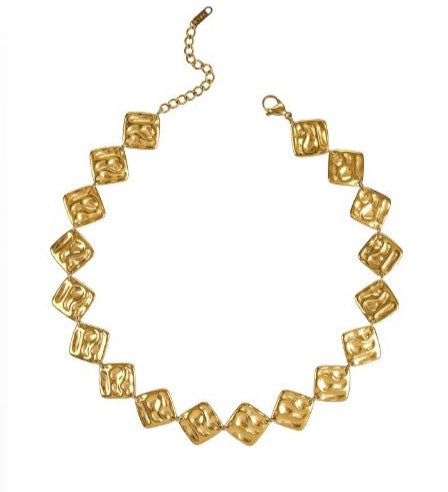 This beautiful piece is made with 18K gold plated stainless steel that is tarnish resistant and designed to last you years. Its unique hammered square design gives it an extra flair of classic elegance, making it perfect for any occasion. Pair the American Heiress Necklace with your favorite dress or blouse for a touch of refinement and grace
