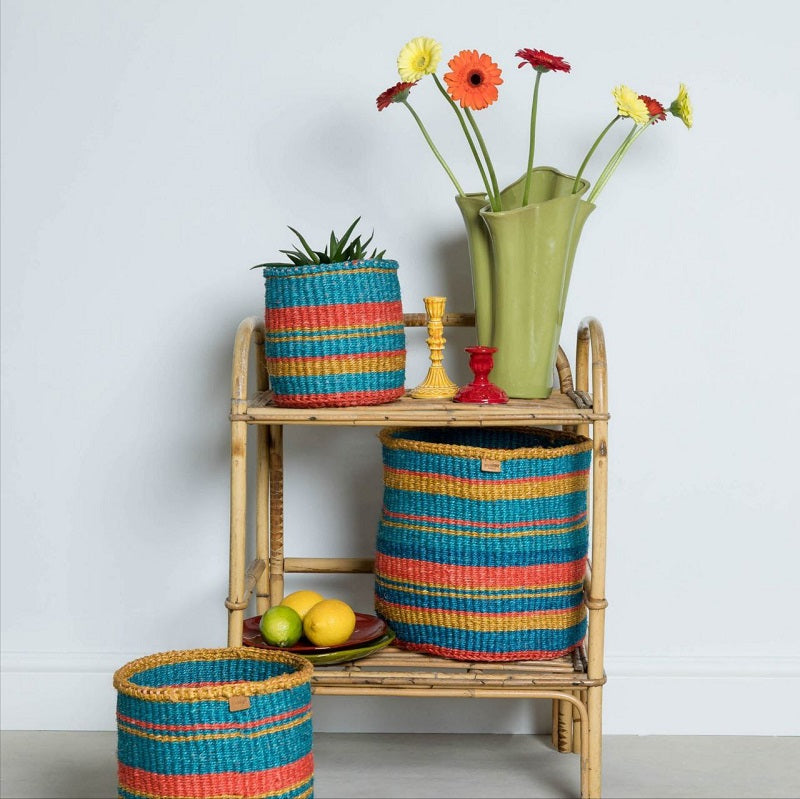 Our coloured baskets are hand made by a small Kenyan weaving cooperative of forty ladies, with a dedicated dye manager appointed to oversee colour consistency and quality. We keep this highly skilled collective busy with regular orders of this popular style, so sisal grass is sourced ready-rolled when orders come in. This local grass is hand-dyed in large vats and hung out to dry before a traditional twining method is used – a meticulous skill that most weavers have known from a young age.