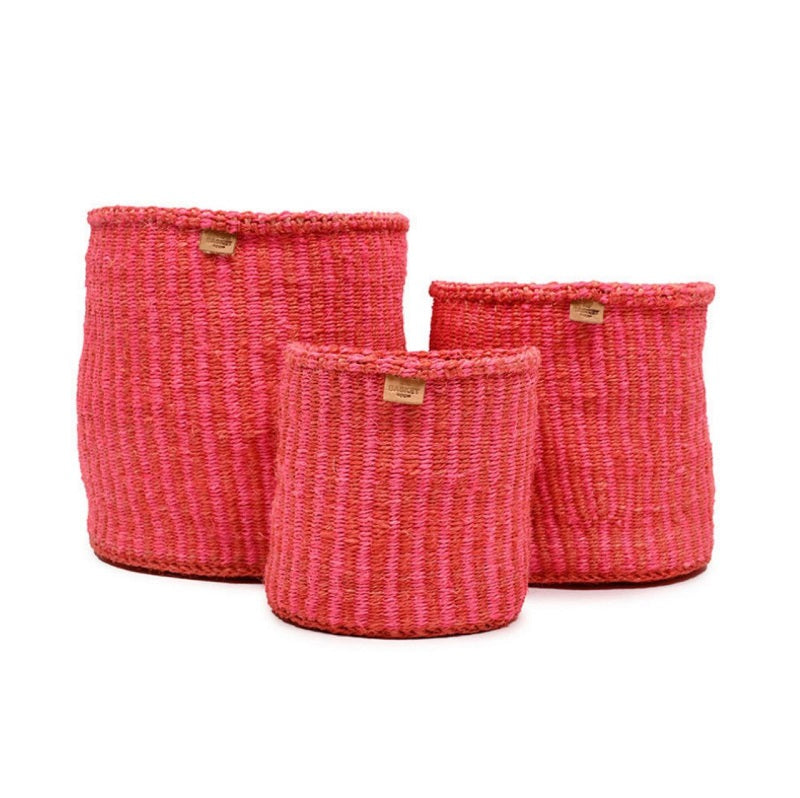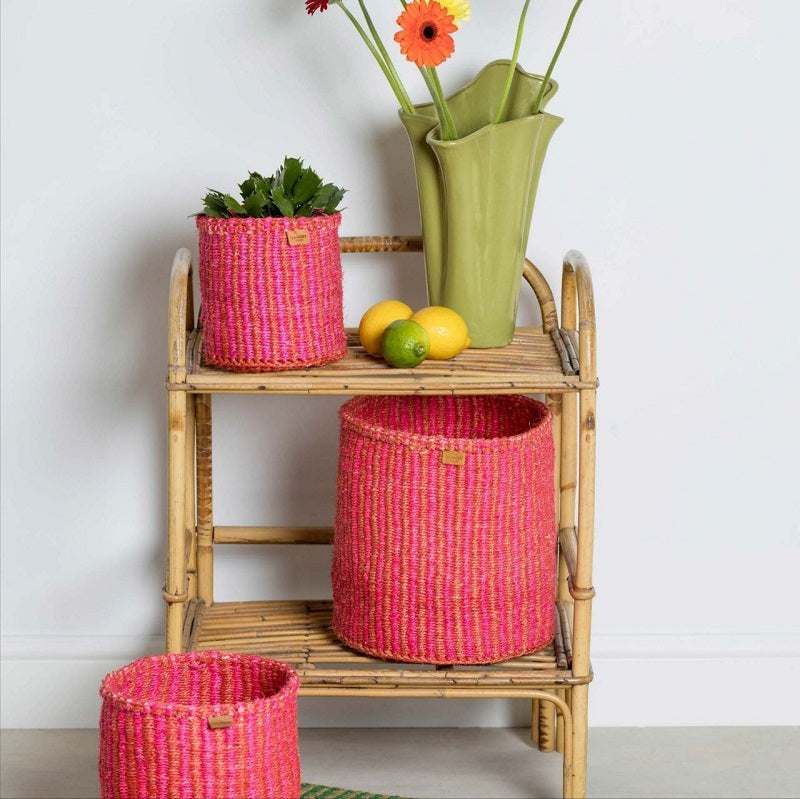 Flaunting bold vertical pinstripes in bright pink against red, our KIWANDA baskets are handwoven in rural Kenya from local sisal in three different sizes, so there is one for almost every home storage solution. Use a small basket for jewellery and watches, remote controls and cables, whilst our medium and large woven baskets make lovely storage for slippers, gloves, scarves and rugs, toys, laundry, loo rolls and craft projects. These bright pinstripe baskets also make excellent woven planters for your houseplants – and we can’t think of a more perfect new home gift for someone who loves all things bright!