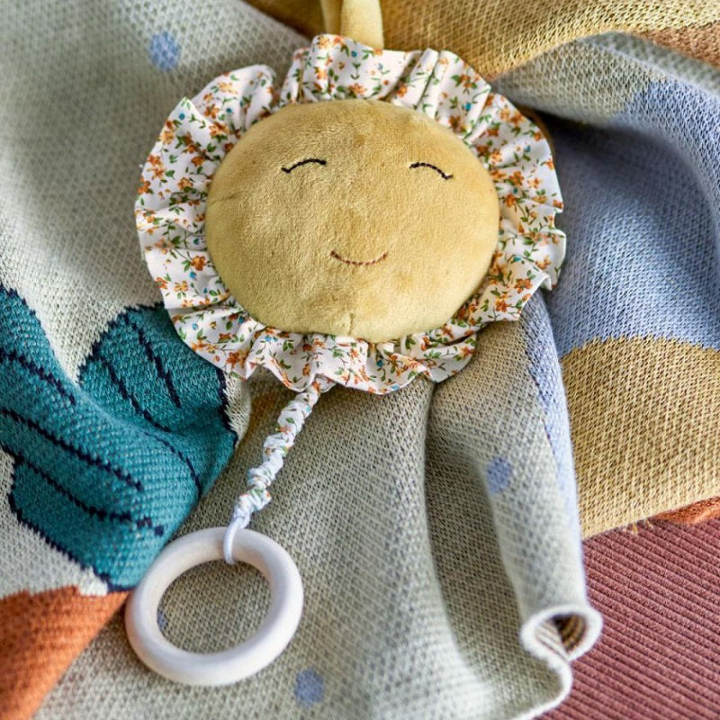 The Vigge Mobile by Bloomingville MINI is a sweet music mobile that plays the loveliest melody when you pull the string. The yellow mobile features a smiling face surrounded by fine floral fabric, bringing joy and coziness to any nursery. The music mobile comes in a beautiful gift box, making it the perfect christening or maternity gift for new parents.